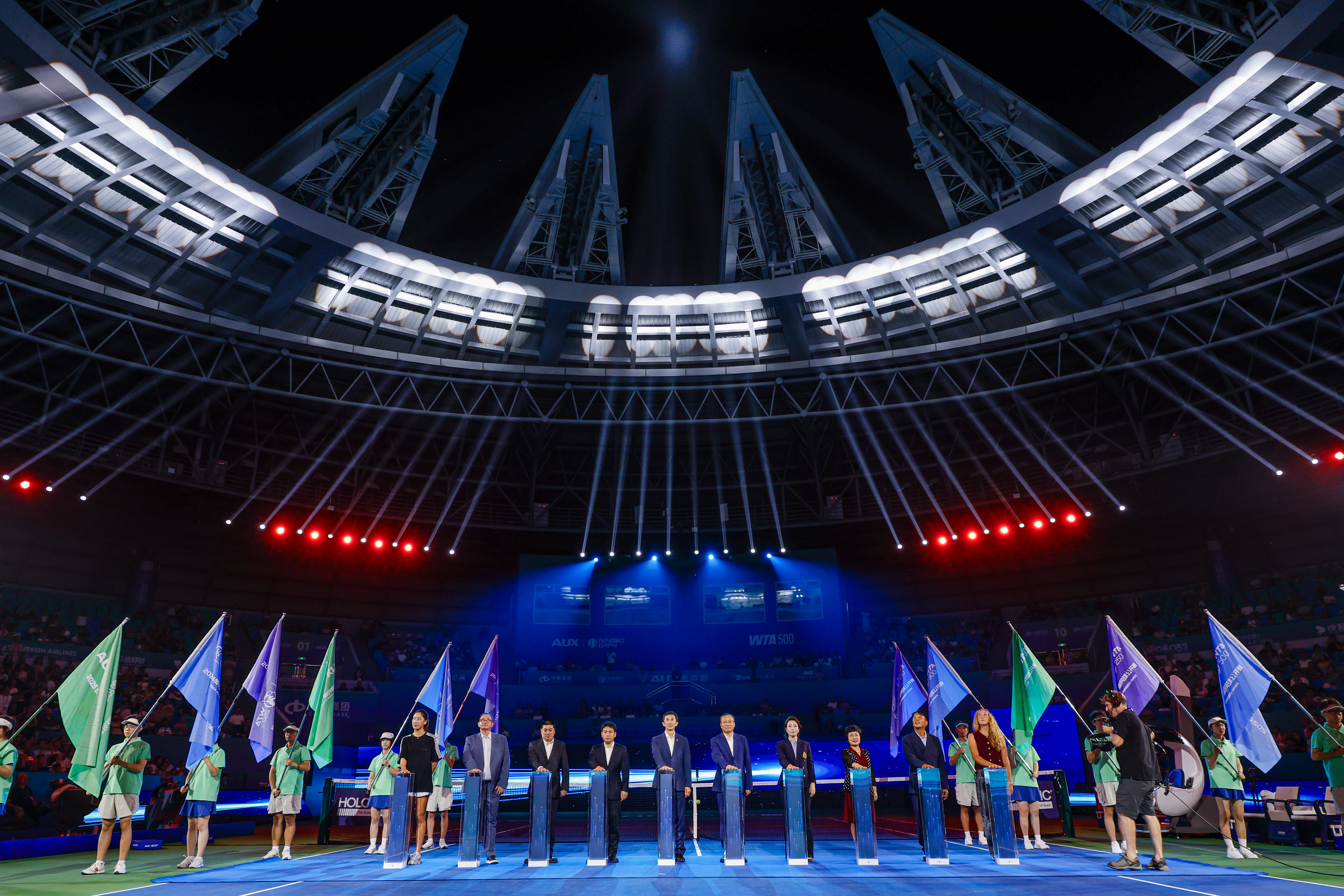 随后举行的授旗仪式上,三位领导分别为裁判、球童和志愿者代表授旗。旗帜的传递,象征着赛事责任与荣耀的接力,也凝聚着对幕后工作者的敬意与肯定。在倒计时声中,与会领导嘉宾共同触动启动装置,宣告2025奥克斯·宁波网球公开赛正式开幕——“茶花”屋盖开启,LED屏幕上绽放的光影与掌声交织,点燃了全场的热情,也标志着这场汇聚全球网球精英的赛事全面开启。未来一周,来自世界各地的顶尖网球选手将齐聚宁波,为广大球迷带来一场场巅峰对决,共同诠释网球运动的无限魅力。